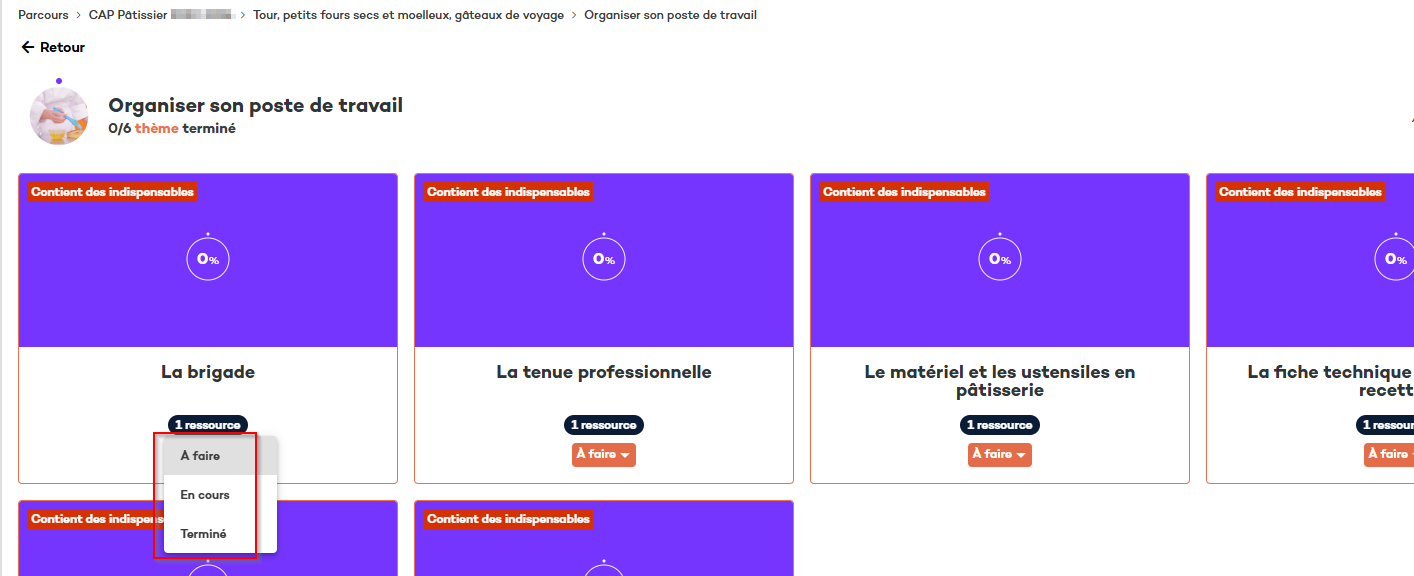 Suivez votre avancement dans la formation en tenant à jour votre Médiathèque ! Pour cela, il vous suffit de marquer vos cours comme étant “à faire”, “en cours” ou “terminé”.