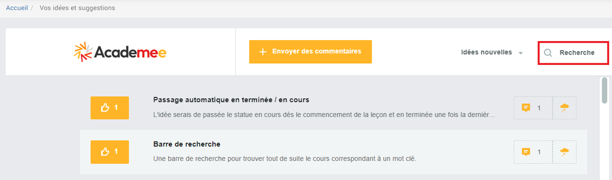 - consulter les suggestions faites par d’autres apprenants ou rechercher des idées déjà existantes, via la barre de recherche ;