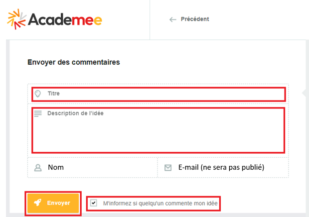 - Envoyer votre suggestion, en cliquant sur le bouton “Envoyer des commentaires”, puis en complétant les différents champs à renseigner ;