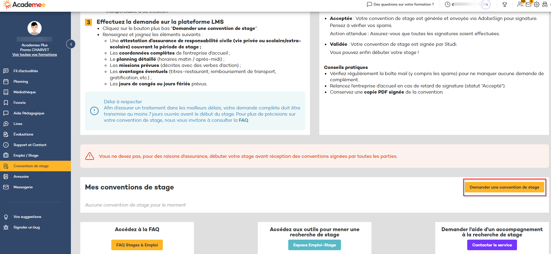 1. Rendez-vous dans l’onglet “Convention de stage” puis cliquez sur “Demander une nouvelle convention”.