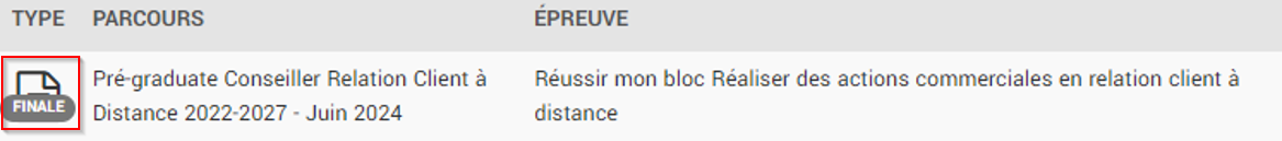 → Pour les Titres RNCP : le logo « Finale » dans la colonne « Type » de la liste des évaluations vous permet d’identifier les examens certifiants et les évaluations obligatoires pour l’obtention de votre Titre/Diplôme