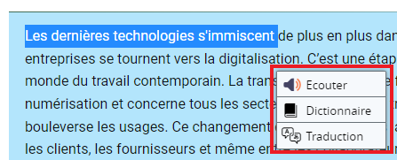 Vous avez également la possibilité d’écouter uniquement un extrait de texte ou de le traduire : pour cela, il vous suffit de sélectionner le passage que vous souhaitez écouter et de cliquer sur la fenêtre qui apparaît.