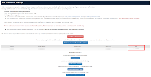 Le statut de votre convention est visible sur l’onglet “Convention de stage” de votre plateforme.
