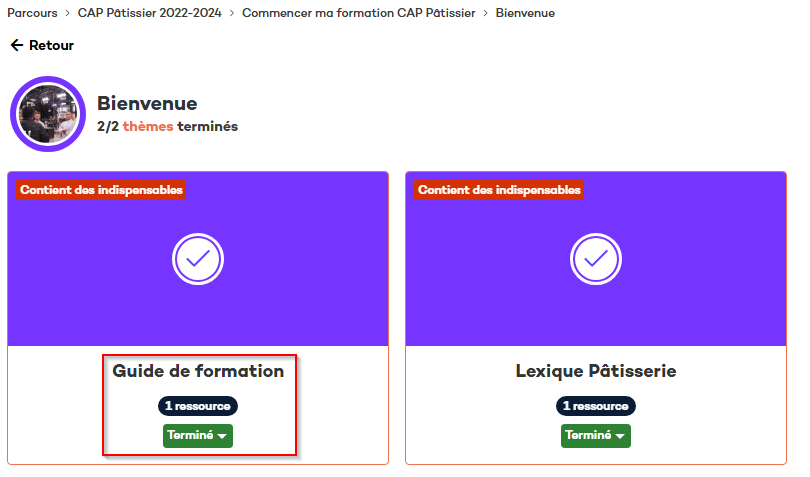 Cliquez sur l’une des rubriques suivantes, selon votre parcours : « Commencer ma formation », « Bienvenue » > « Guide de formation ».