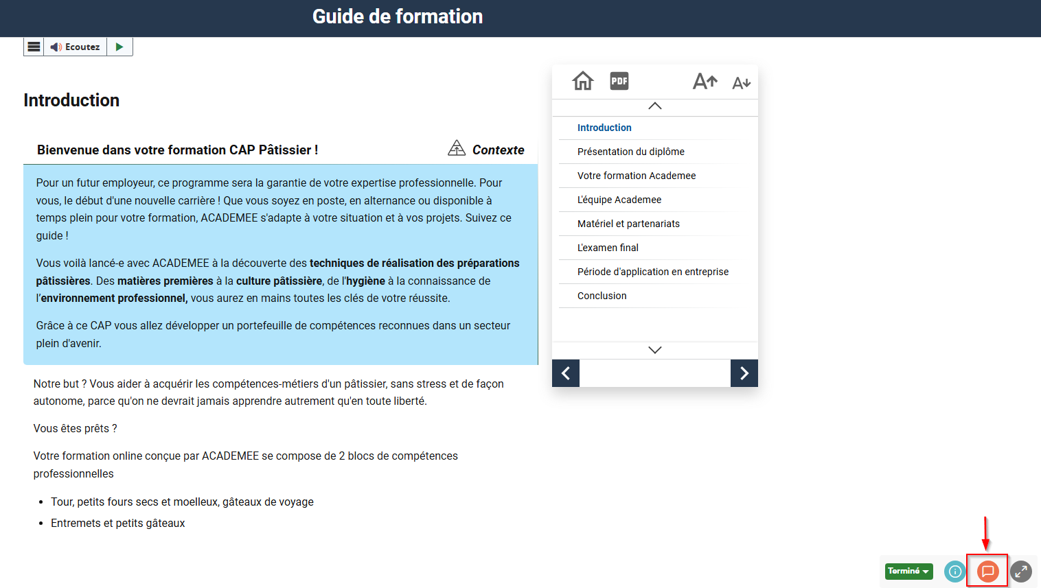 Si vous avez des questions en lisant votre guide de formation ou guide de blocs/d’épreuves, vous pouvez utiliser le bouton« Contribuer » en haut à droite pour interroger l’équipe pédagogique.