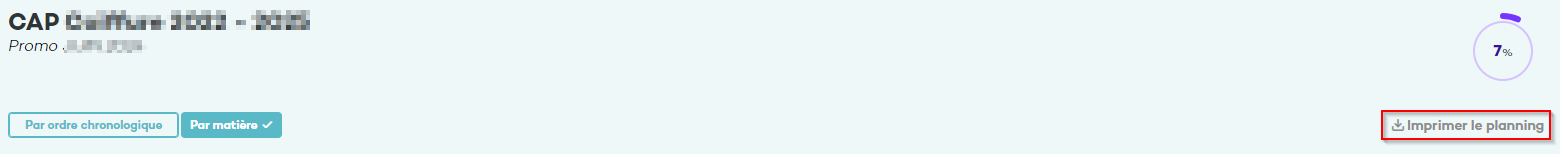 Vous pouvez télécharger votre planning en sélectionnant le filtre « Par matière » puis cliquant sur « Imprimer le planning » en haut à droite.
